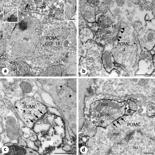 Presence of POMC and GLP-1R-immunoreactivity in the ARC nucleus at the ultrastructural level. GLP-1R-immunoreactivity is associated with the membrane of POMC neurons and axons establishing synapses on POMC-IR dendrites and cell bodies in the ARC nucleus. Electron micrograph (a) illustrates the presence of both POMC (highly electron-dense gold-silver granules) and GLP-1R (electron-dense Ni-DAB precipitate) immunoreactivity in the same neuron. Note the association of GLP-1R-immunoreactivity with the cell membrane of POMC neurons (white arrowheads and insets). High magnification images illustrate asymmetric (b, black arrowheads)- and symmetric (c, arrows)-type synaptic associations between GLP-1R-IR axons and POMC-IR dendrites, while (d) demonstrates the presence of a symmetric-type axosomatic synapse (arrows) between a GLP-1R-IR axon and the perikaryon of a POMC neuron. POMC, proopiomelanocortin; GLP-1R-IR, glucagon-like peptide-1 receptor-immunoreactive; d, dendrite; ax, axon varicosity; mit, mitochondria; nu, nucleus; ARC, arcuate. Scale bar, 2 µm on a and 500 nm on b–d and on the insets.