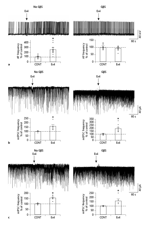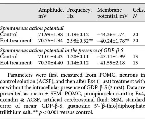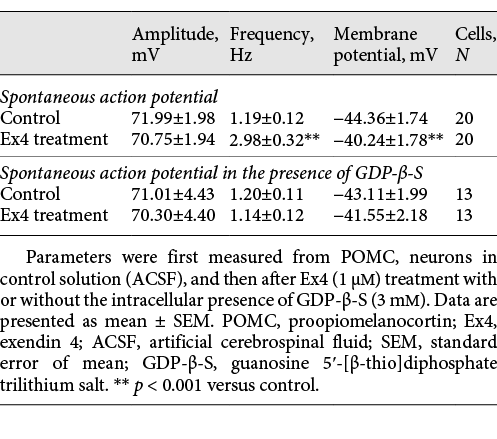 As intracellular administration of the G-protein inhibitor GDP-β-S completely prevented the effect of Ex4 on the firing and membrane potential of POMC neurons, these effects are exerted directly on the studied POMC neurons. A similar conclusion was drawn by Secher et al. [] showing that the effect of GLP-1 was not prevented by simultaneous inhibition of GABAergic and glutamatergic signaling.