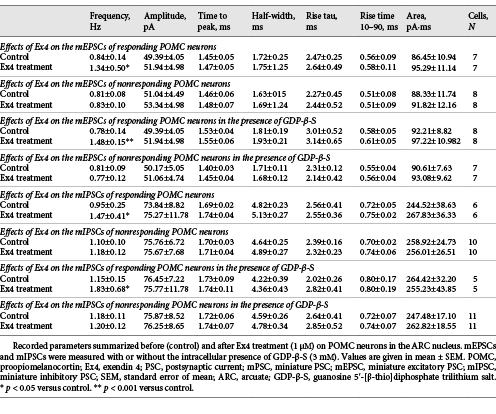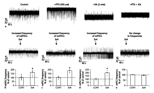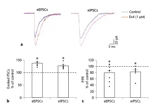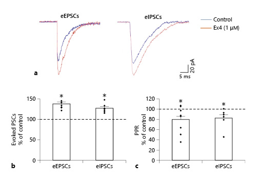 Event detection was performed using the Clampfit module of pClamp 10.4 software (Molecular Devices). All data for each experiment were normalized relative to baseline and described as mean ± standard error of mean. Measured parameters of the miniature potentials were as follows: peak amplitude (pA), event frequency (Hz), time to peak (ms), half-width (ms), rise time 10 90 (ms), and rise tau (ms). The criterion for separating measured neurons as responding to treatment was either a 15% increase or decrease compared to baseline frequency values (either spontaneous firing frequency or PSC frequency values). We did not separate responding cells based on changes in membrane potentials. Data were analyzed using the paired Student’s t test in the case of self-controlled experiments (before and after Ex4 treatment). An α-level of p < 0.05 was regarded as statistically significant in all statistical tests.