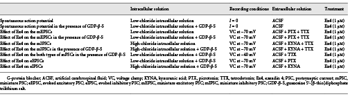 In the case of the mEPSC or eEPSC recordings to block GABAA receptor-mediated IPSCs, picrotoxin (PTX: 100 µM; Sigma) was included in the ACSF. For recording mIPSCs or eIPSCs, the ACSF contained kynurenic acid (KYNA: 2 mM; Sigma).