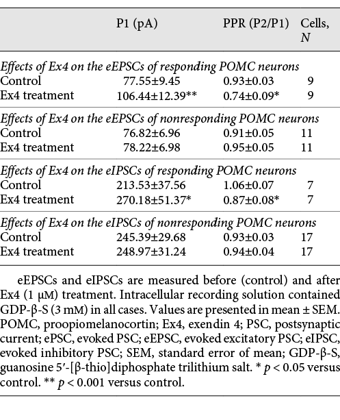 Examination of the ePSCs of the POMC neurons further supported that GLP-1 signaling facilitates the inputs of POMC neurons. Ex4 significantly increased the peak amplitude of eEPSCs in almost half of the POMC neurons and the peak amplitude of eIPSCs in one-third of POMC neurons. The ratio of the POMC neurons with GLP-1-responsive inputs was very similar to experiments in which the mPSCs were studied. The Ex4 treatment significantly decreased the paired-pulse ratio both in the case of eEPSCs and eIPSCs, further demonstrating the direct effect of GLP-1 signaling on the inputs of POMC neurons.