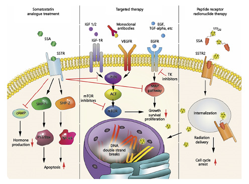 Targeted therapy for GEP-NETs is a broad umbrella that encompasses several different mechanisms of tumor suppression. Based upon available randomized controlled trial data, the primary focus of targeted therapy in the treatment of GEP-NETs involves inhibition of the mTOR pathway and tyrosine kinase pathway.