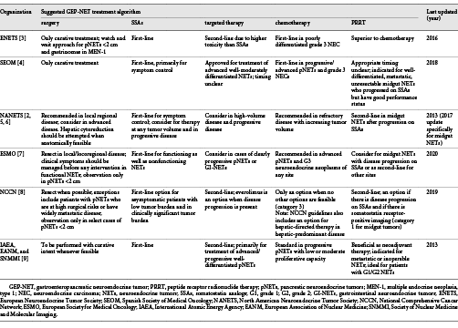 Evidence-based treatment algorithms and clinical practice guidelines for GEP-NETs have been proposed by a number of oncologic societies around the world [-]. Table 1 summarizes the current guidelines for treatment proposed by several prominent societies that interface with patients with GEP-NETs. Although Table 1 does not encompass all existing societies and their recommendations, it does take into account the existing body of literature on GEP-NET therapies. Notably, each listed society has a similar recommendation for treatment sequencing with the exception of the timing of PRRT. At this time, there is no global consensus as to the timing and sequencing of PRRT. With developing research on the widespread benefits of PRRT, as well as its limitations, it will be necessary to reevaluate current sequencing guidelines through a lens that encompasses current and emerging data on PRRT to determine optimal patient care. In this narrative review, we examined original clinical research, case report studies, and narrative reviews in an effort to identify the current state of PRRT sequencing with respect to other treatment modalities for GEP-NETs, given the most current and up-to-date literature on GEP-NET therapy.
