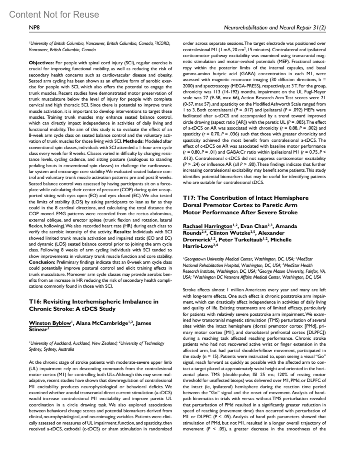 Revisiting Interhemispheric Imbalance in Chronic Stroke: A tDCS StudyT16:Byblow, WinstonMcCambridge, AlanaStinear, JamesAuthor information1University of Auckland, Auckland, New Zealand;2University of Technology Sydney, Sydney, AustraliaNeurorehabilitation and Neural Repair 31(2):p N8, February 2017.Copyright ©2017Sage Publications