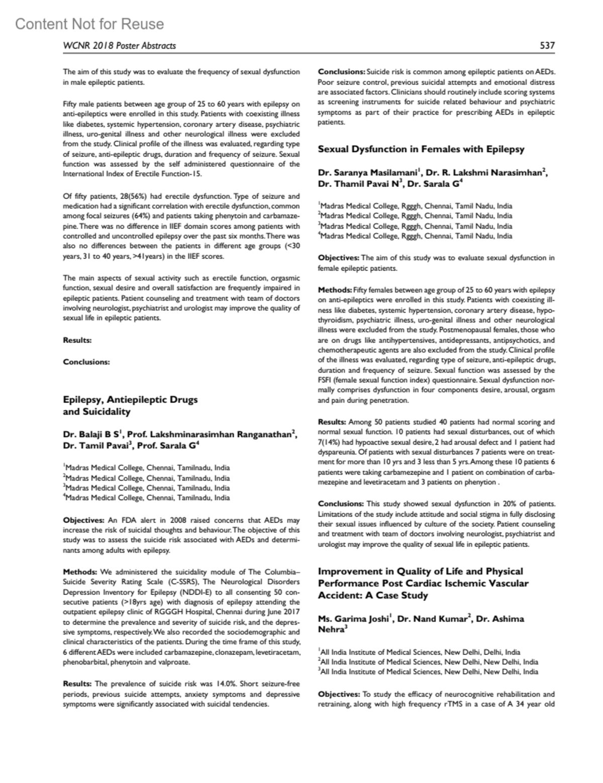 Epilepsy, Antiepileptic Drugs and SuicidalityBalaji, Dr. B SRanganathan, Prof. LakshminarasimhanPavai, Dr. TamilSarala, Prof. GAuthor information1 Madras Medical College, Chennai, Tamilnadu, IndiaNeurorehabilitation and Neural Repair 32(5):p 537, April-May 2018.Copyright ©2018Sage Publications