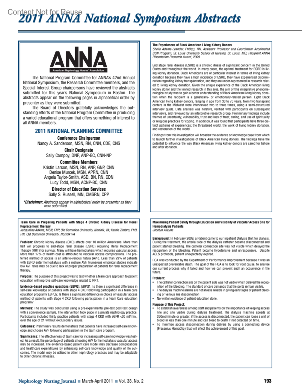 Maximizing Patient Safety through Education and Visibility of Vascular Access Site for Hemodialysis PatientsAlleyne, JocelynNephrology Nursing Journal 38(2):p 193, March-April 2011.Copyright © 2011 ANNA