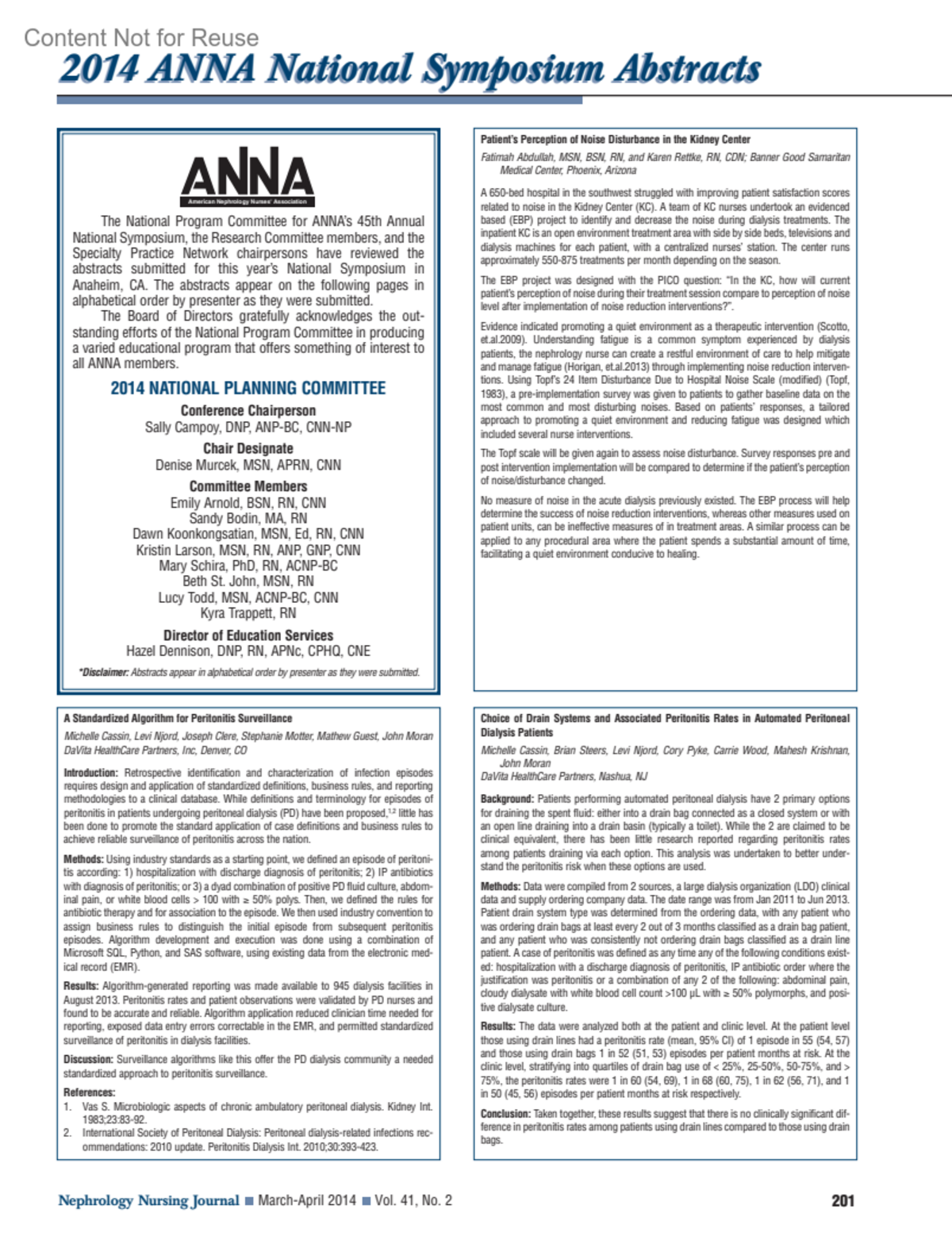 Electronic Medical Record Use and Satisfaction in the U.S. Dialysis SettingVavrinchik, Jennifer MSN, RN, CNNYang, Alex MD, MBABurrows-Hudson, Sally MSN, RN, CNNAuthor informationNephrology Clinical Solutions, Lisle, ILNephrology Nursing Journal 41(2):p 208, March-April 2014.Copyright © 2014 ANNA