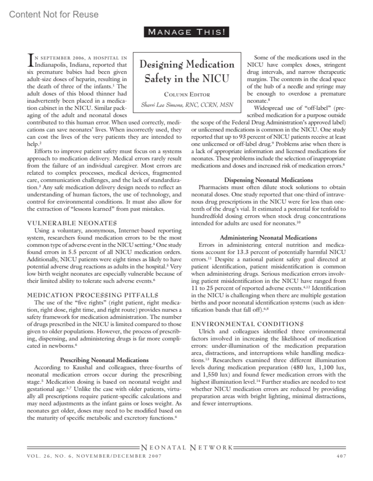 Sherri Lee Simons is the Department of Defense Navy Implementation Lead for SafeCare Systems, a division of Apptis Healthcare. She is also a management, humor, and perinatal consultant and is the founder of Simons and Company. Ms. Simons has managed various clinical units, including NICUs, for more than 14 years and has more than 18 years of experience as an NICU staff nurse. She holds an MSN in nursing administration from George Mason University (1998) and a BSN from San Diego State University (1986).