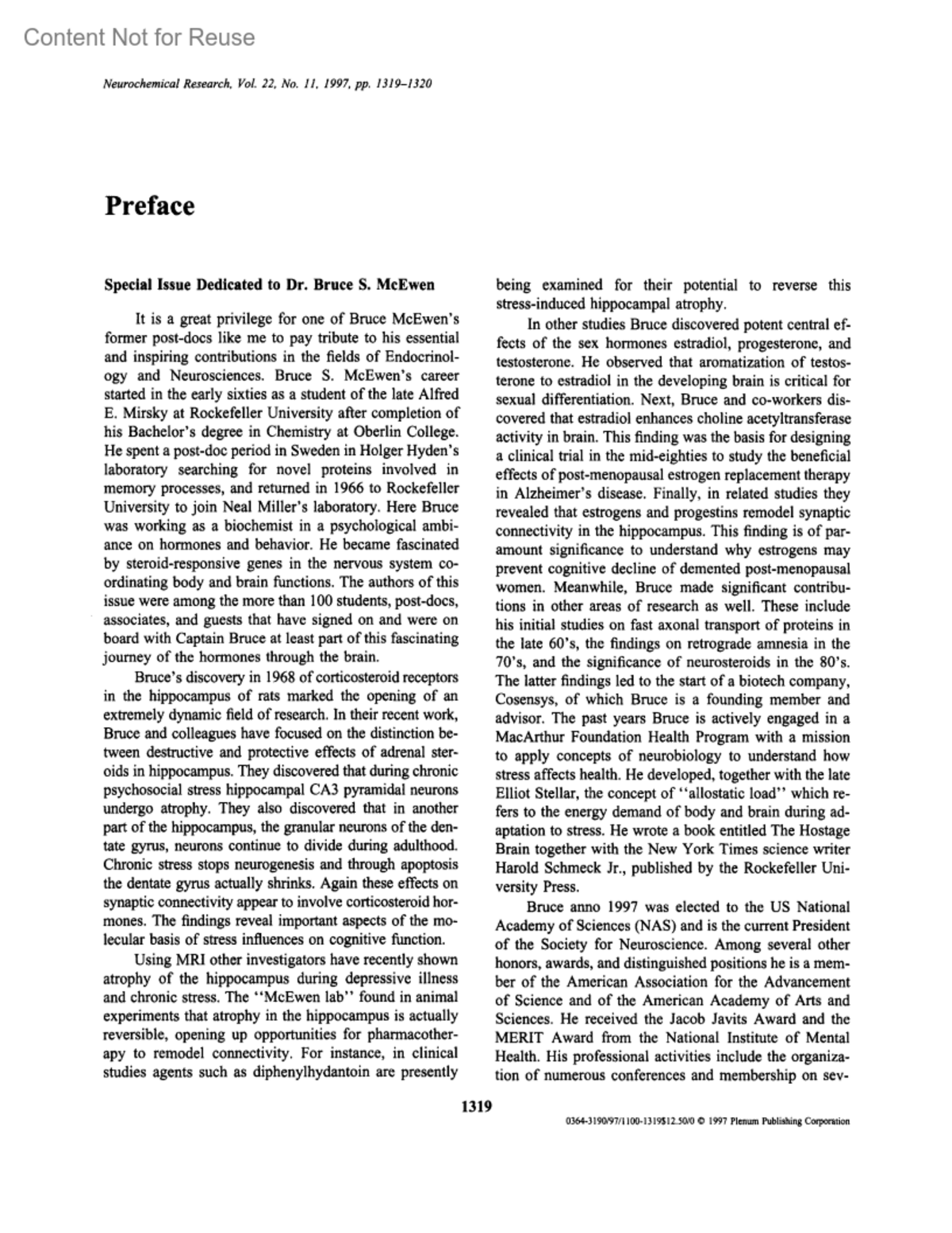 Special Issue Dedicated to Dr. Bruce S. McEwenKloet, E. Ronald DeOitzl, Melly S.Author informationGuest Editor, Leiden, The NetherlandsNeurochemical Research 22(11):p 1319-1320, November 1997.Copyright ©1997 Kluwer Academic Publishers