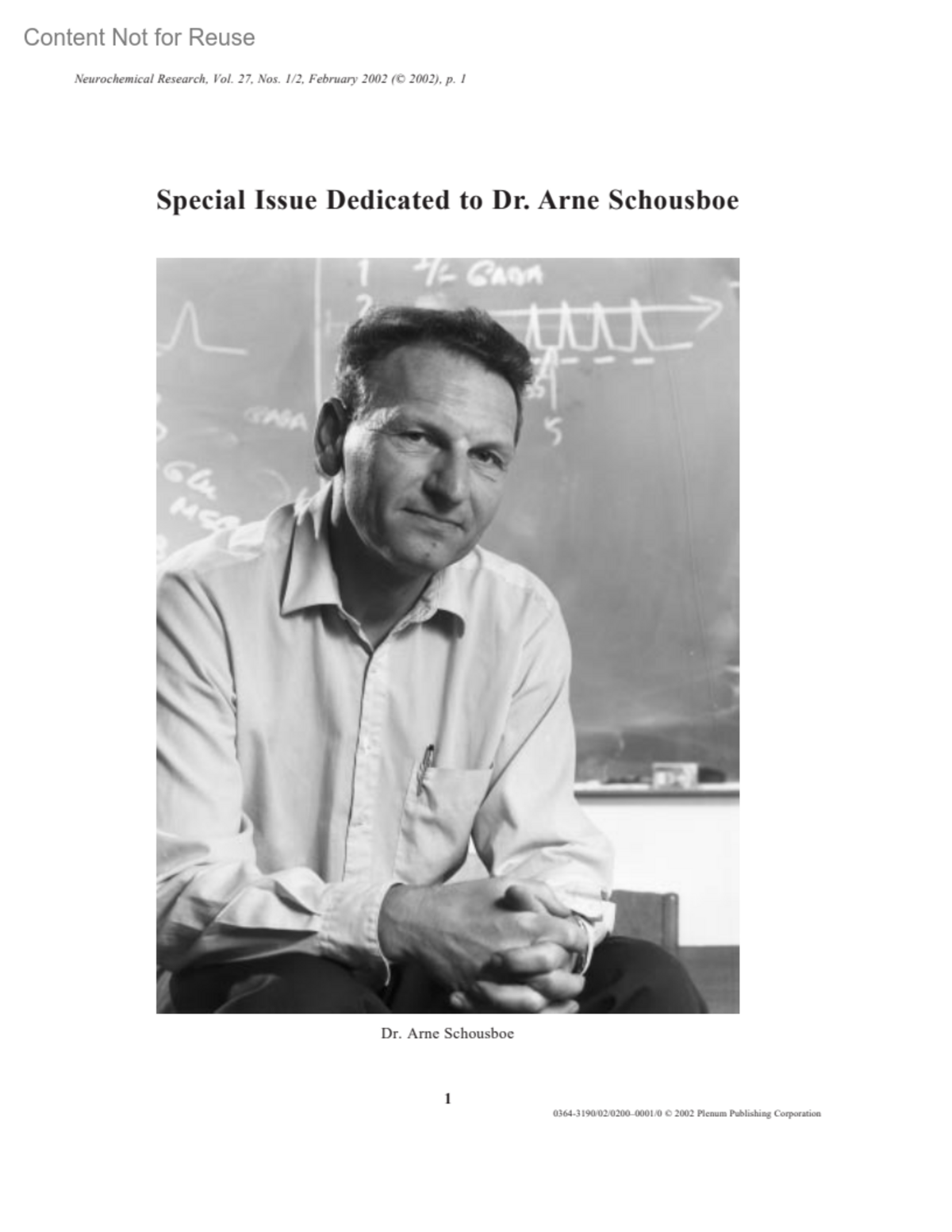 A Tribute to Arne SchousboeNeurochemical Research 27(2):p 1-3, February 2002.Copyright ©2002 Kluwer Academic Publishers