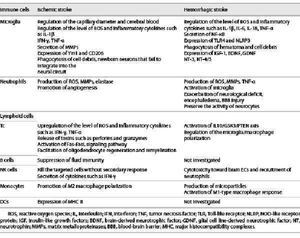 A plethora of studies have demonstrated the critical role of immune and inflammatory factors in the progression of ischemic stroke. The immune mechanisms involved in ischemic stroke in vertebrates involve two major components: natural immunity and adaptive immunity. Although the type of immune cells varies with immune responses, there is a considerable overlap in the reaction processes. A broad spectrum of immune cells participate in the causation of ischemic brain injury, for example, microglia, neutrophils, lymphoid cells, monocytes, and DCs [-, -].