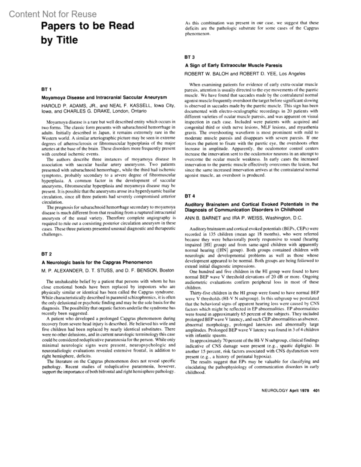 Papers to be Read by TitleNeurology 28(4):p 401-411, April 1978.Copyright ©1978 American Academy of Neurology