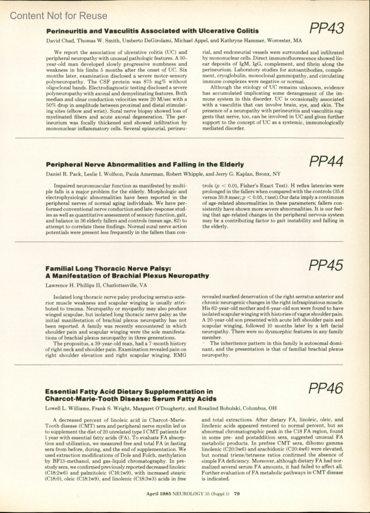Familial Long Thoracic Nerve Palsy: A Manifestation of Brachial Plexus NeuropathyPP45Phillips, Lawrence H. IIAuthor informationCharlottesville, VANeurology 35(4):p 79, April 1985.Copyright © 1985 American Academy of Neurology