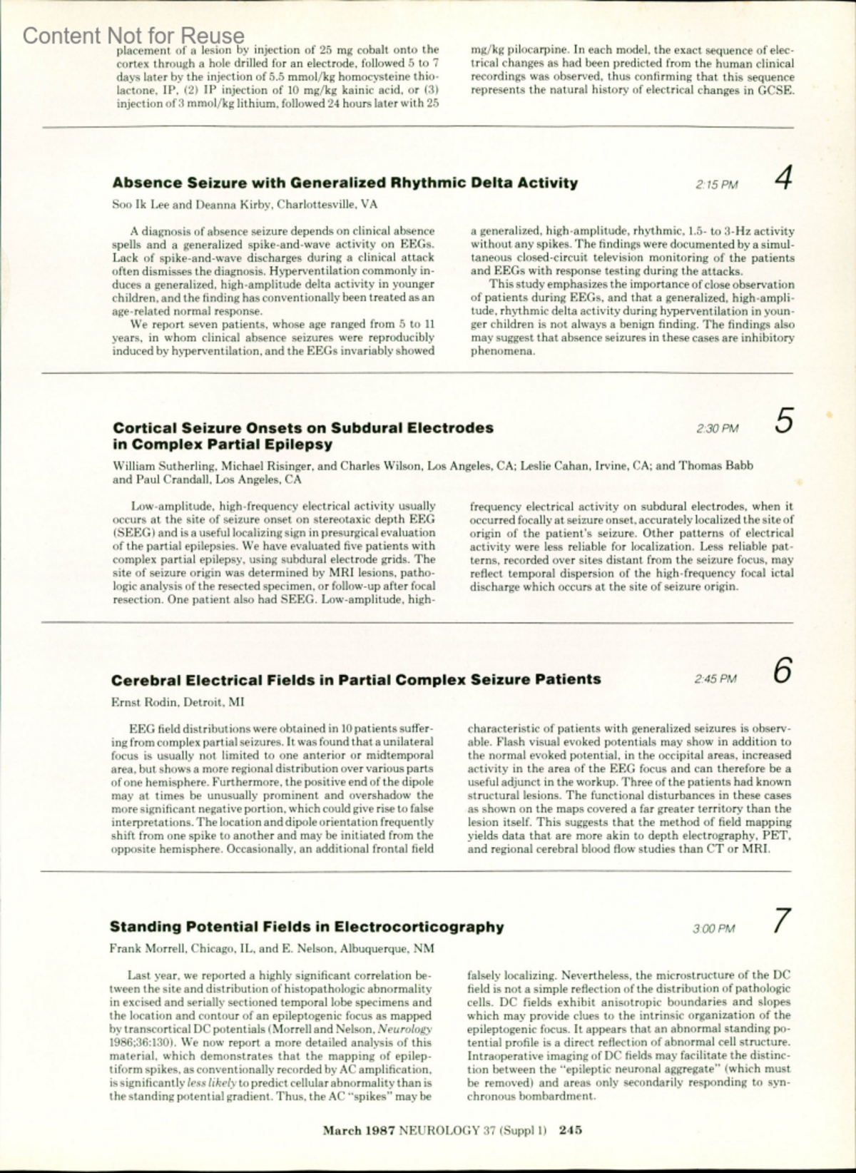Absence Seizure with Generalized Rhythmic Delta Activity2:15 PM4Lee, Soo IkKirby, DeannaAuthor informationCharlottesville, VANeurology 37(3):p 245, March 1987.Copyright © 1987 American Academy of Neurology