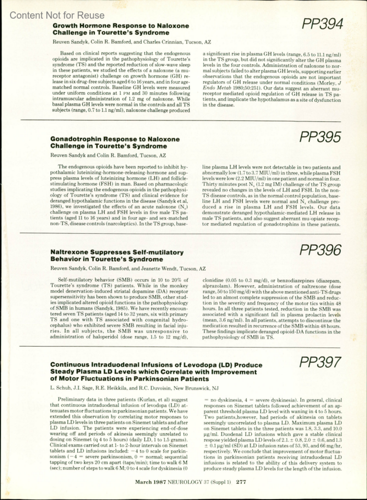 Growth Hormone Response to Naloxone Challenge in Tourette's SyndromePP394Sandyk, ReuvenBamford, Colin R.Crinnian, CharlesAuthor informationTucson, AZNeurology 37(3):p 277, March 1987.Copyright © 1987 American Academy of Neurology