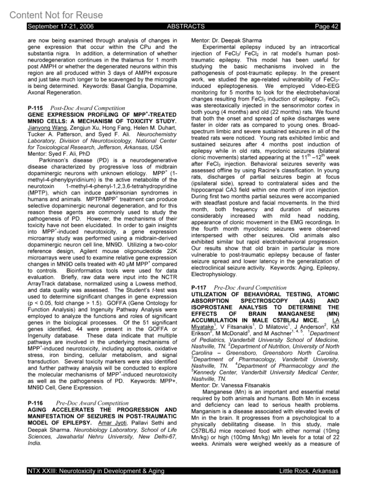 AGING ACCELERATES THE PROGRESSION AND MANIFESTATION OF SEIZURES IN POST-TRAUMATIC MODEL OF EPILEPSY.P-116Jyoti, AmarSethi, PallaviSharma, DeepakAuthor informationNeurobiology Laboratory, School of LifeSciences, Jawaharlal Nehru University, New Delhi-67,India.Mentor: Dr. Deepak SharmaNeurotoxicology 27(6):p 42, December 2006.Copyright © 2006Elsevier, Inc.