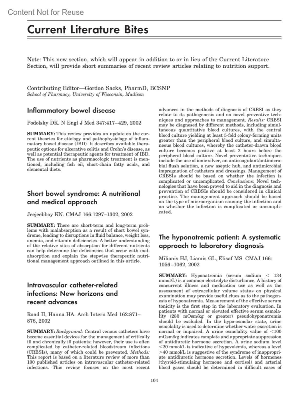 Short bowel syndrome: A nutritional and medical approachJeejeebhoy, K NAuthor informationCMAJ 166:1297–1302, 2002Nutrition in Clinical Practice 18(1):p 104, February 2003.Copyright ©2003Sage Publications