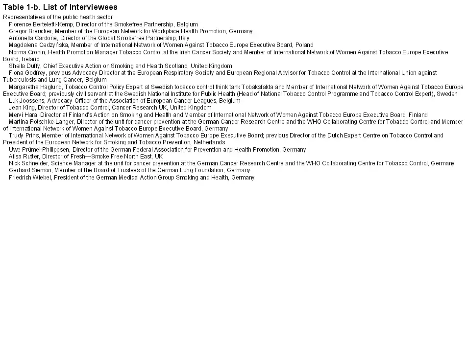 A review of policy documents related to the development of the European Council Recommendation on smoke-free environments identified 175 individuals involved in the policy process, their organizational affiliations and policy stance. Stakeholders were assigned to three groups: (a) key actors crucial to the process (e.g., representatives of EU institutions and member states strongly involved in the policy’s development, n = 49), (b) stakeholders with considerable interest in the process (e.g., other actors involved in the development of the policy, n = 59), and (c) individuals who had shown an interest but had not directly engaged in the process (n = 67). Drawing primarily from the first category, interviewees were selected using purposive sampling, aimed at recruiting representatives that varied by type of organization, policy position, geographical remit, national affiliation, and involvement at different stages of the policy process.