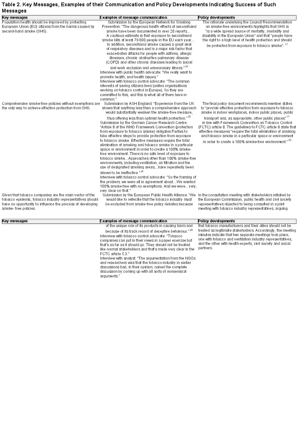 Members of the smoke-free alliance jointly promoted the following three key messages in the policy debates: (a) population health should be improved by protecting EU citizens from the harms caused by SHS; (b) comprehensive smoke-free policies without exemptions are the only way to achieve effective protection from SHS; and (c) given that tobacco companies are the main vector of the tobacco epidemic, tobacco industry representatives should have no opportunity to influence the process of developing smoke-free policies. Table 2 provides selected examples both of how the key messages were communicated and of developments in the policy process which indicate that the messages met with some success. Individual members of the alliance, including representatives of the pharmaceutical sector, health professional bodies and organizations focused on specific diseases, also put considerable efforts into emphasizing smoking cessation as a flanking measure to smoke-free policies. While largely demonstrating agreement on the above three key messages, alliance members were almost evenly divided on preferred type of policy. Half advocated for binding legislation, whereas the other half argued for a nonbinding recommendation (based on the assumption that this policy type would be more likely to receive political support).