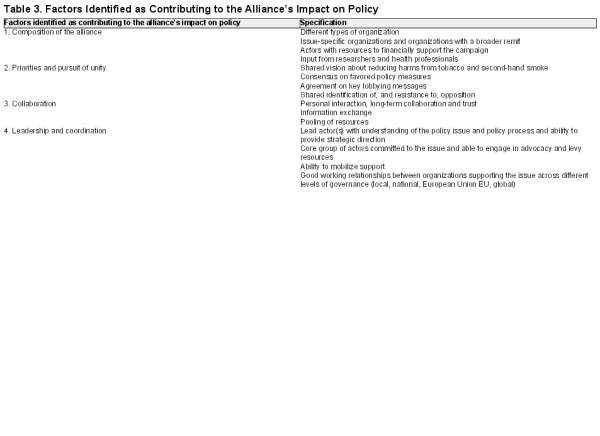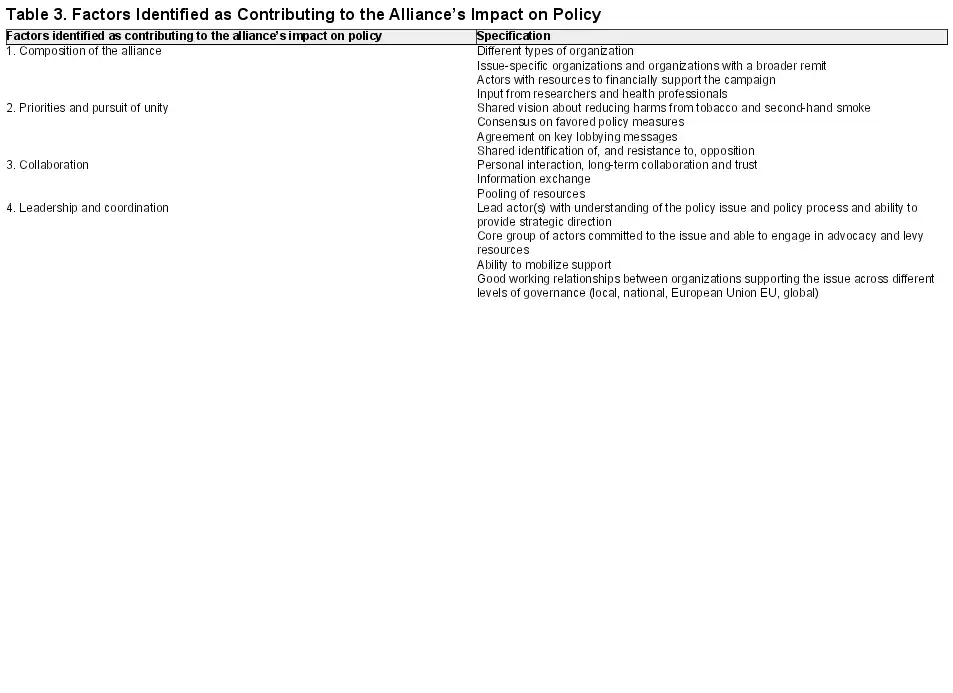 Table 3 outlines the four key factors identified as contributing to the alliance’s positive impact on policy: (a) composition, (b) priorities and pursuit of unity, (c) collaboration, and (d) leadership and coordination.