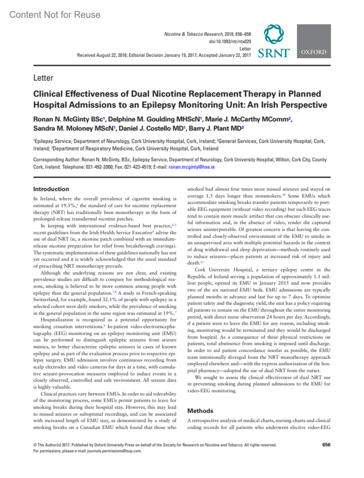 Clinical Effectiveness of Dual Nicotine Replacement Therapy in Planned Hospital Admissions to an Epilepsy Monitoring Unit