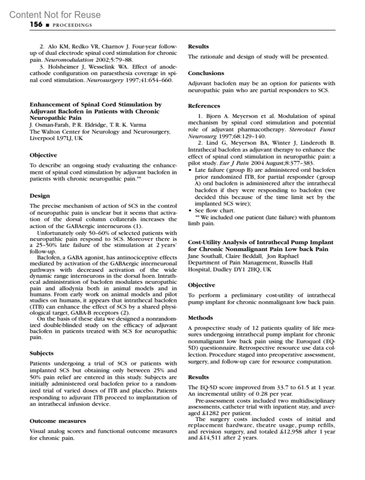 Enhancement of Spinal Cord Stimulation by Adjuvant Baclofen in Patients with Chronic Neuropathic PainOsman-Farah, J.Eldridge, P. R.Varma, T. R. K.Author informationThe Walton Center for Neurology and Neurosurgery, Liverpool L97LJ, UKNeuromodulation 9(2):p 156, April 2006.Copyright © 2006 Blackwell Publishing Ltd.