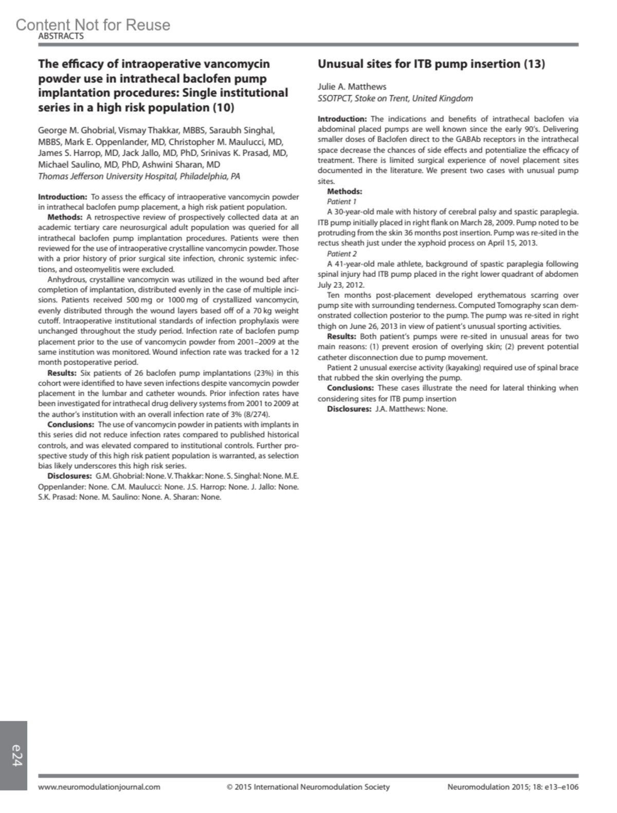 The efficacy of intraoperative vancomycin powder use in intrathecal baclofen pump implantation procedures: Single institutional series in a high risk population (10)