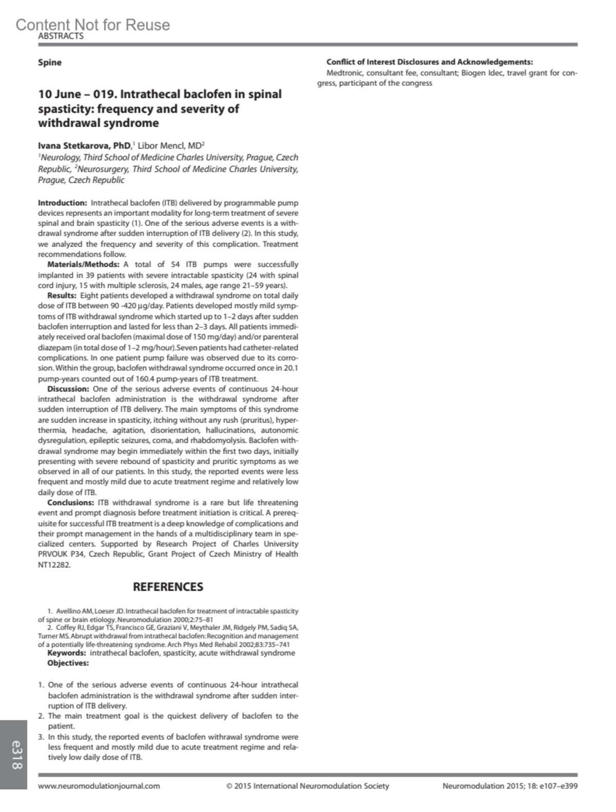 Intrathecal baclofen in spinal spasticity: frequency and severity of withdrawal syndrome10 June – 019.Stetkarova, Ivana PhDMencl, Libor MDAuthor information1Neurology, Third School of Medicine Charles University, Prague, Czech Republic,2Neurosurgery, Third School of Medicine Charles University, Prague, Czech RepublicNeuromodulation 18(6):p e318, August 2015.Copyright © 2015 Blackwell Publishing Ltd.
