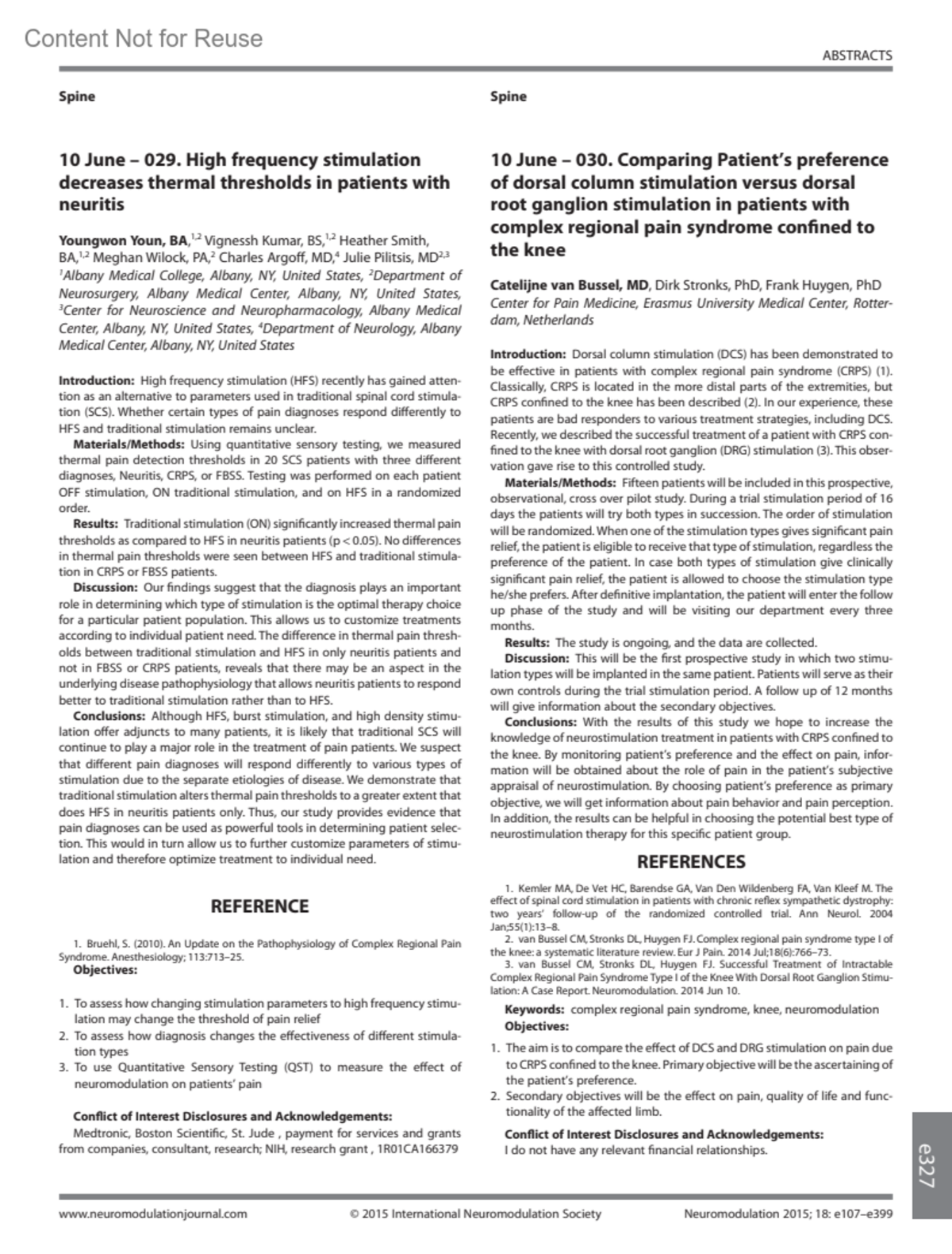 Neuromodulation 18(6):p e327, August 2015.