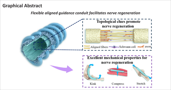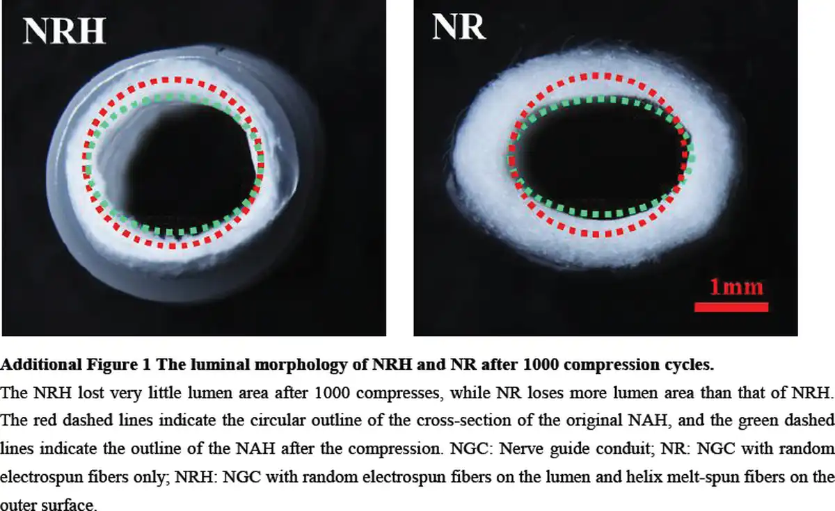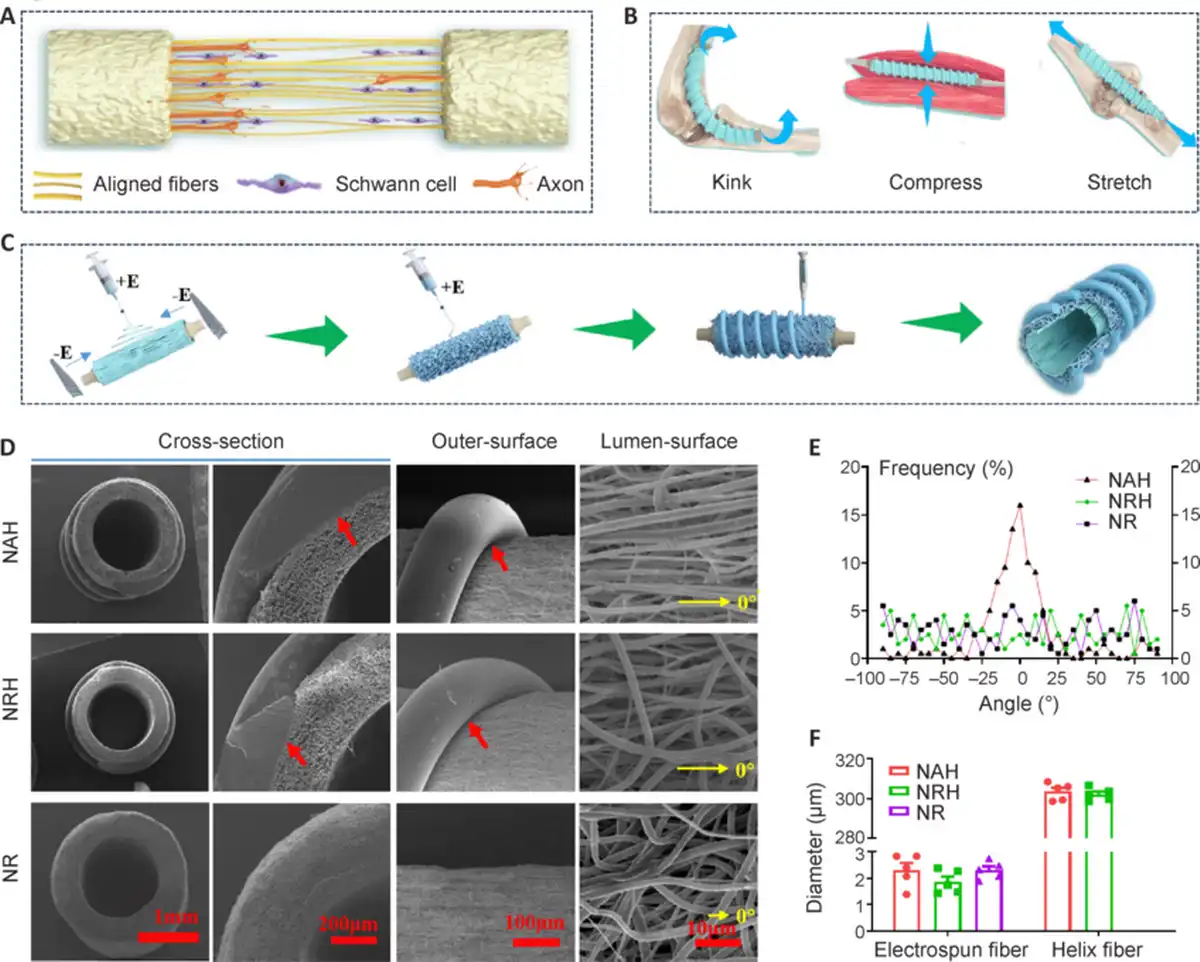 In conclusion, we have developed a novel NGC that features aligned microfibers in the lumen and helical melt-spun fibers on the outer surface, designated as NAH. The aligned microfibers on the lumen surface effectively promote nerve regeneration, while the helical melt-spun fibers provide exceptional resistance to kinking and compression. The dual-layer NGC is simple to manufacture and addresses practical challenges in clinical application, making it a promising candidate for clinical translation.
