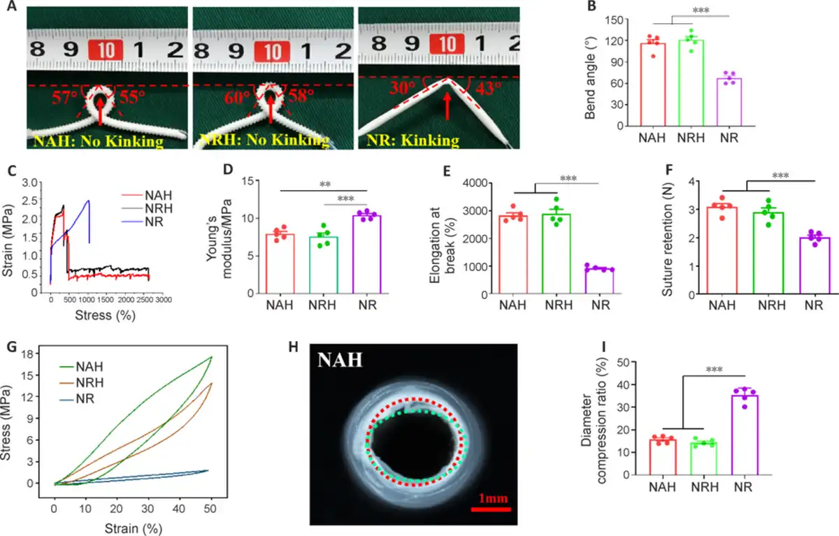 (A) Resistance to kinking. NAH and NRH maintained a tubular shape even when bent into a loop (bend radius, approximately 0.5 cm). Arrows indicate where the NGCs are most bent and likely to kink. The dashed lines indicate the horizontal. Bending angles of the loops are shown in degrees. (B) Quantitative bend angle analysis (n = 5). (C) Tensile stress-strain curves. (D, E) Statistical analysis of Young’s modulus (D), and elongation at break (E; n = 5). (F) Suture retention strength (n = 5). (G) Compression mechanics curve. (H) Luminal morphology of NAH after 1000 compression cycles. The red dashed line indicates the circular outline of the cross-section of the original NAH; the green dashed line indicates the outline after compression. (I) Luminal diameter loss rate after 1000 compressions (n = 5). Data are expressed as means ± SEM. **P < 0.01, ***P < 0.001 (one-way analysis of variance with Tukey’s post hoc test). NAH: NGC with aligned electrospun fibers on the lumen and helix melt-spun fibers on the outer surface; NGC: nerve guide conduit; NR: NGC with random electrospun fibers only; NRH: NGC with random electrospun fibers on the lumen and helix melt-spun fibers on the outer surface; ns: not significant.