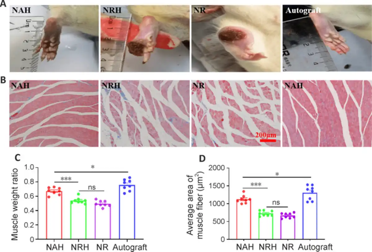 Rats in the NAH group had fewer foot ulcers and exhibited less toe self-harm than NRH and NR rats 4 weeks after implantation (Figure 6A). The NAH group displayed minimal ulceration and toe self-mutilation, whereas no significant ulcers or foot self-injury were observed in the autograft group, indicating that nerve recovery was superior in the NAH and autograft groups than the NRH and NR groups. Masson staining analysis showed that the NAH and autograft group rats had more red muscle fibers and less collagen than the NRH and NR rats (Figure 6B). Furthermore, the mass weight of the gastrocnemius muscle was higher in the NAH group than the NRH and NR groups (Figure 6C), as was the average area of muscle fibers (Figure 6D). Additionally, gastrocnemius muscle mass weight and muscle fiber area were higher in the autograft group than the NAH group. These findings suggest that NAH is more effective in guiding the repair of sciatic nerve function and regulating the activity of the gastrocnemius muscle than NRH and NR.