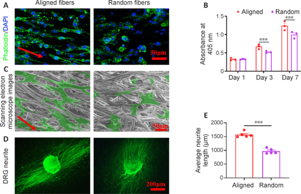 Effect of aligned fibers on guiding the growth of PC12 and DRG cells.