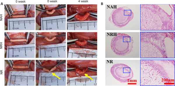 (A) Anti-kinking properties of NAH, NRH and NR were evaluated using the three-point bending test immediately and 4 weeks after surgery. NAH and NRH showed no kinking in the bent state during and after implantation, while NR showed obvious kinking. Yellow arrows indicate the kinking sites. (B) Lumen collapse was evaluated by H&E staining of cross-sections 4 weeks after implantation. No collapse was observed in NAH and NRH; NR showed collapse. H&E: Hematoxylin-eosin; NAH: NGC with aligned electrospun fibers on the lumen and helix melt-spun fibers on the outer surface; NGC: nerve guide conduit; NR: NGC with random electrospun fibers only; NRH: NGC with random electrospun fibers on the lumen and helix melt-spun fibers on the outer surface.