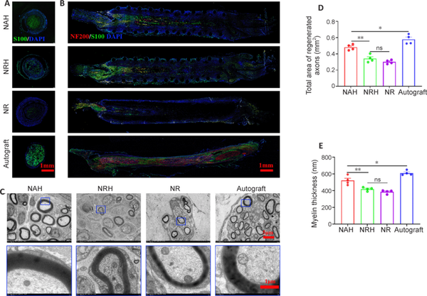 (A) Representative S100 antibody staining images of cross-sections. The NAH showed better Schwann cells regeneration compared with that of NRH and NR, though still worse than that of autograft. S100, Alexa Fluor 488, green; DAPI, blue. (B) Representative co-staining images of longitudinal sections stained by S100 and NF200 antibodies. The NAH showed the best regeneration indicated by the Schwann cells and the nerve filaments compared with NRH and NR, but this was still not as good as that with the autograft. S100, Alexa Fluor 488, green; NF200, Alexa Fluor 594, red; DAPI, blue. Yellow arrows point to suture site. (C) The axon regeneration was observed by TEM. The NAH showed better axons regeneration in view of the myelin sheath, similar to that of autograft, while the NRH and NR group were worse. (D, E) quantitative analysis of axon area (D) based on the low-magnification TEM images and myelin thickness (E) based on high-magnification TEM images (n = 4). The NAH demonstrated higher axon area (D) and myelin thickness (E) compared with NRH and NR, but lower axon area and myelin thickness than autograft. Data are expressed as mean ± SEM. *P < 0.05, **P < 0.01 (one-way analysis of variance with Tukey’s post hoc test). DAPI: 4′,6-Diamino-2-phenylindole; NAH: NGC with aligned electrospun fibers on the lumen and helix melt-spun fibers on the outer surface; NF200: neurofilament 200; NGC: nerve guide conduit; NR: NGC with random electrospun fibers only; NRH: NGC with random electrospun fibers on the lumen and helix melt-spun fibers on the outer surface; ns: not significant; TEM: transmission electron microscope.
