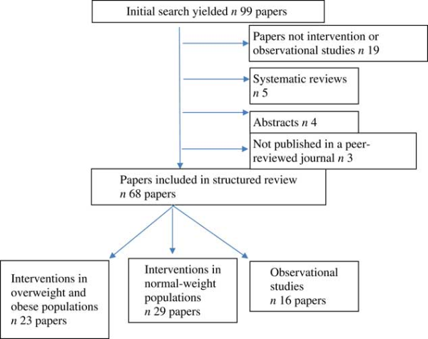 The majority of interventions have taken place in the last 5 years. Most of the interventions in obese/overweight populations were undertaken in female populations, while studies of normal-weight populations included more men. Many of the interventions had small sample sizes of fifty or fewer subjects: fourteen of the overweight/obese studies(,,,,–,–,,,), and ten of the studies in normal-weight populations(,–,,,–). Three of the studies in the overweight/obese populations were carried out among children(,,); one of these studies had a sample size of more than 300 but the results of this study were not clearly described(). The majority of the studies() among normal-weight populations were performed with students(,,,–,–).