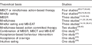 Mindfulness-based cognitive therapy/mindfulness action-based cognitive therapy, and mindful eating were the most commonly used approaches and were both used in four studies. Table 1 outlines the details of the theoretical basis of these studies.