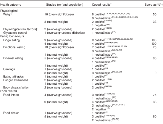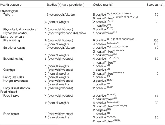 Ten outcomes were given a percentage score as described previously. In studies that measured weight, binge eating, emotional eating, food intake (in overweight and obese populations) and food choice (in normal-weight populations) the score was 50 % or above, indicating that most of the results were positive or neutral/mixed. Only two studies had negative results related to weight gain() and an increase of energy intake().