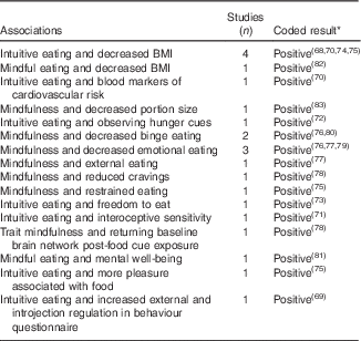 For both the intervention and observational studies, results were ‘coded’ and summarised as follows. A ‘positive’ code indicated the outcome demonstrated a beneficial effect of mindfulness (for example, decreased binge eating, weight loss, and reduced energy intake). A ‘neutral’ code indicated that there was no significant effect from the intervention. A mixed code indicated that there were some positive and neutral results. ‘Negative’ codes indicated that the measured outcome was in an opposite direction to the hypothesis.