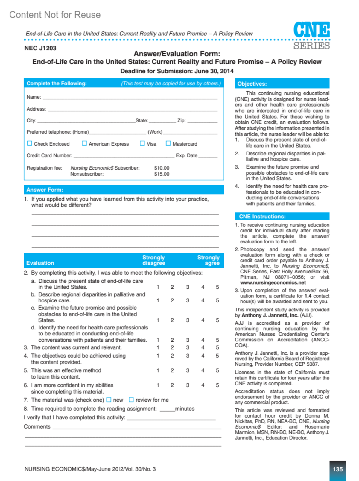 End-of-Life Care in the United StatesCurrent Reality and Future Promise – A Policy ReviewNursing Economic$ 30(3):p 135, May-June 2012.Copyright © 2012 by Jannetti Publications, Inc. All rights reserved.