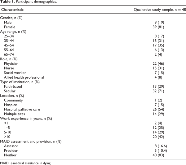 The 48 multi-disciplinary participants from Vancouver (n = 26) and Toronto (n = 22) respectively included HPC physicians (n = 22), nurses (n = 15), social workers (n = 7), and other allied health providers (n = 4). Most participants identified as female, had over 10 years of work experience, and were employed in secular institutions (Table 1). The average interview length was 50 min (range, 30–97 min).