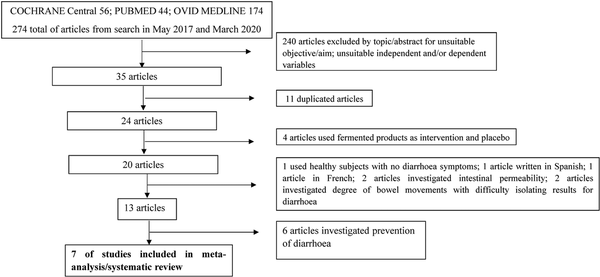 Although the potential of fermented products as alternative treatment for diarrhoeal disease has emerging supportive evidence in adults, there is a need for research to investigate its efficacy as an alternative treatment to ORS, especially in children. Randomised controlled trials (RCTs) and other clinical studies have examined the effect of fermented foods on diarrhoea amongst other gastrointestinal diseases or symptoms in adults (; ; ; ; ), but results have been inconsistent. To date, there is limited evidence and systematic analyses have investigated the efficacy of fermented foods in the prevention and treatment of diarrhoea jointly, using dairy products as the intervention (; ; ; ), although the potential mechanisms for both effects appear to be similar. This systematic review and meta-analysis aim to evaluate the available evidence with respect to the efficacy fermented foods and beverages in comparison with unfermented or heat treated products, including dairy and cereal products, focussing on the treatment of diarrhoea in infants.