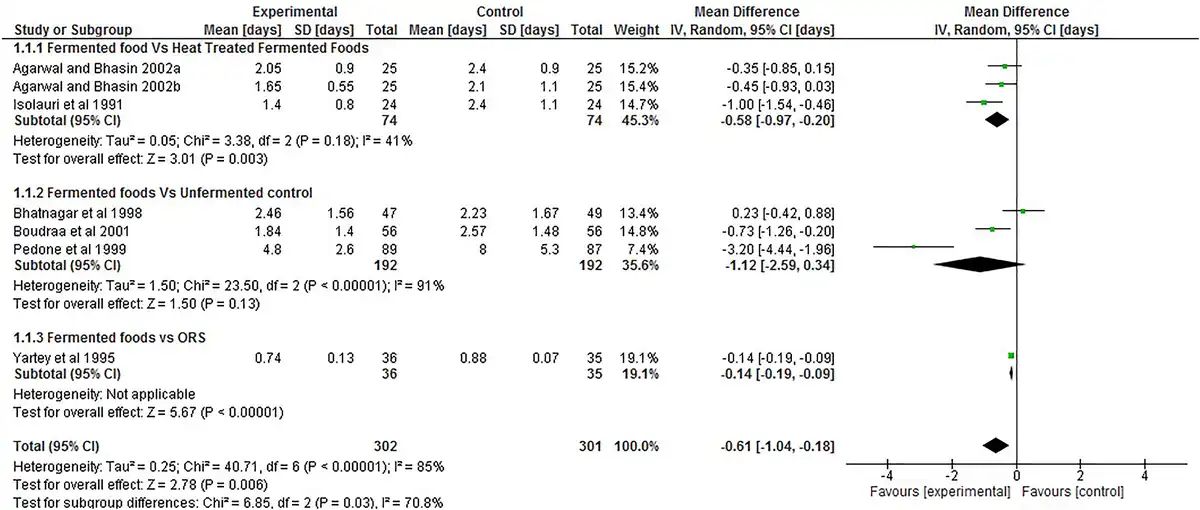 This outcome was reported by six out for the seven RCT included in the current study using a total population of 603 children. The pooled results from the articles (Figure 2), showed that overall mean duration of diarrhoea was significantly less, in the experimental group in comparison with the control group, −0.61 days; 95% CI (−1.04, −0.18). Subgroup analysis separating studies which utilised a non-fermented control and ORS from those that used heat-treated fermented food as control found mean duration of diarrhoea was significantly lower in the group administered fermented foods in comparison with the heat-treated and ORS control group, −0.58 days; 95% CI (−0.97, −0.20) and −0.61 days; 95% CI (−0.19, −0.09) respectively, but not significantly different when compared with the non-fermented control −0.74 days; 95% CI (−1.52, 0.05).
