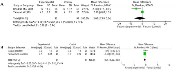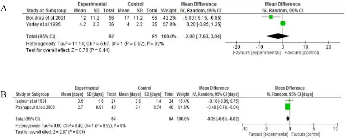 Forest plot showing the effect of intake of fermented food on A) mean daily stool frequency B) duration of hospitalisation. Data shows outcome of random effect models for both analysis analyses.