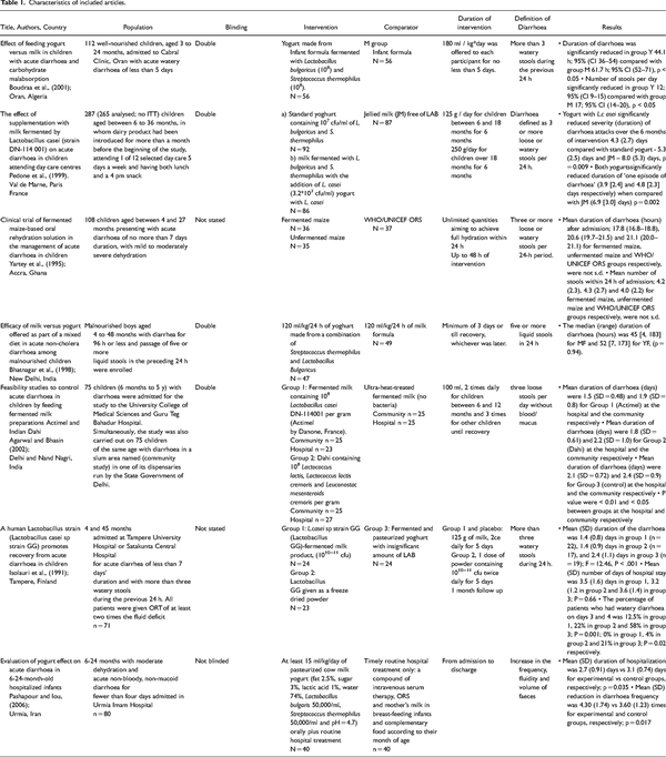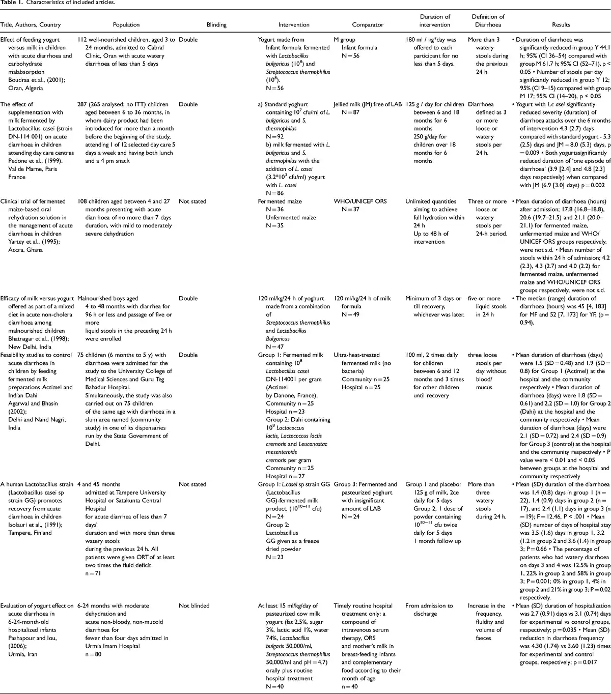 and used WHO’s recommendations of oral rehydration solution (ORS), as control in their study. , , compared the effects of fermented milk against unfermented milk on the outcomes of diarhoea whilst studies by and used heat treated fermented milk as control. and administered ORS to all participants in both groups. However, whilst continued to administer the solution throughout the study, stopped the administration of ORS before patients were randomised into groups.