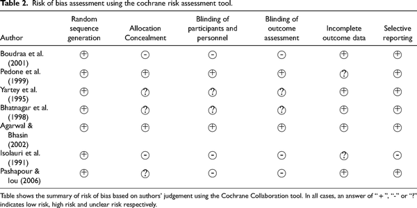 Risk of bias was assessed using the Cochrane Collaboration tool which includes the following criteria: adequacy of random sequence generation; allocation concealment; blinding of participants; personnel, and outcome assessors; incomplete outcome data and selective reporting. In all cases, an answer of “ + ”, “-” and “?” indicated low risk, high risk and unclear risk respectively. There was no formal assessment of publication bias using funnel plot due to small number (< 10) of selected articles ().