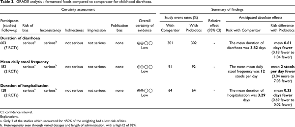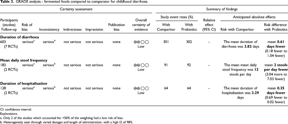 This systematic review and meta-analyses of pooled data from six studies suggests that administering fermented foods during an episode of diarrhoea in infants under five years of age, may reduce the duration of the disease in comparison to the control groups. Fermented foods were shown to reduce the duration of diarrhoea compared to heat treated fermented food controls. This beneficial effect was observed when ORS was used as control, suggesting that fermented foods may have a potential role in the management of diarrhoeal disease. There was no clear effect on daily stool frequency, but duration of hospitalisation was reduced following administration of fermented foods.
