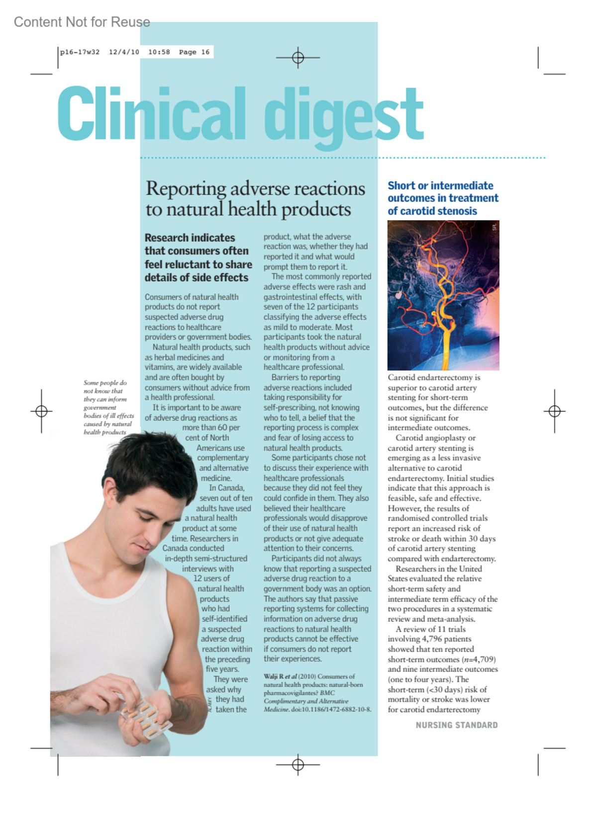 Short or intermediate outcomes in treatment of carotid stenosisNursing Standard 24(32):p 16-17, April 14, 2010.Copyright © Copyright 2010 RCN Publishing Company Ltd.
