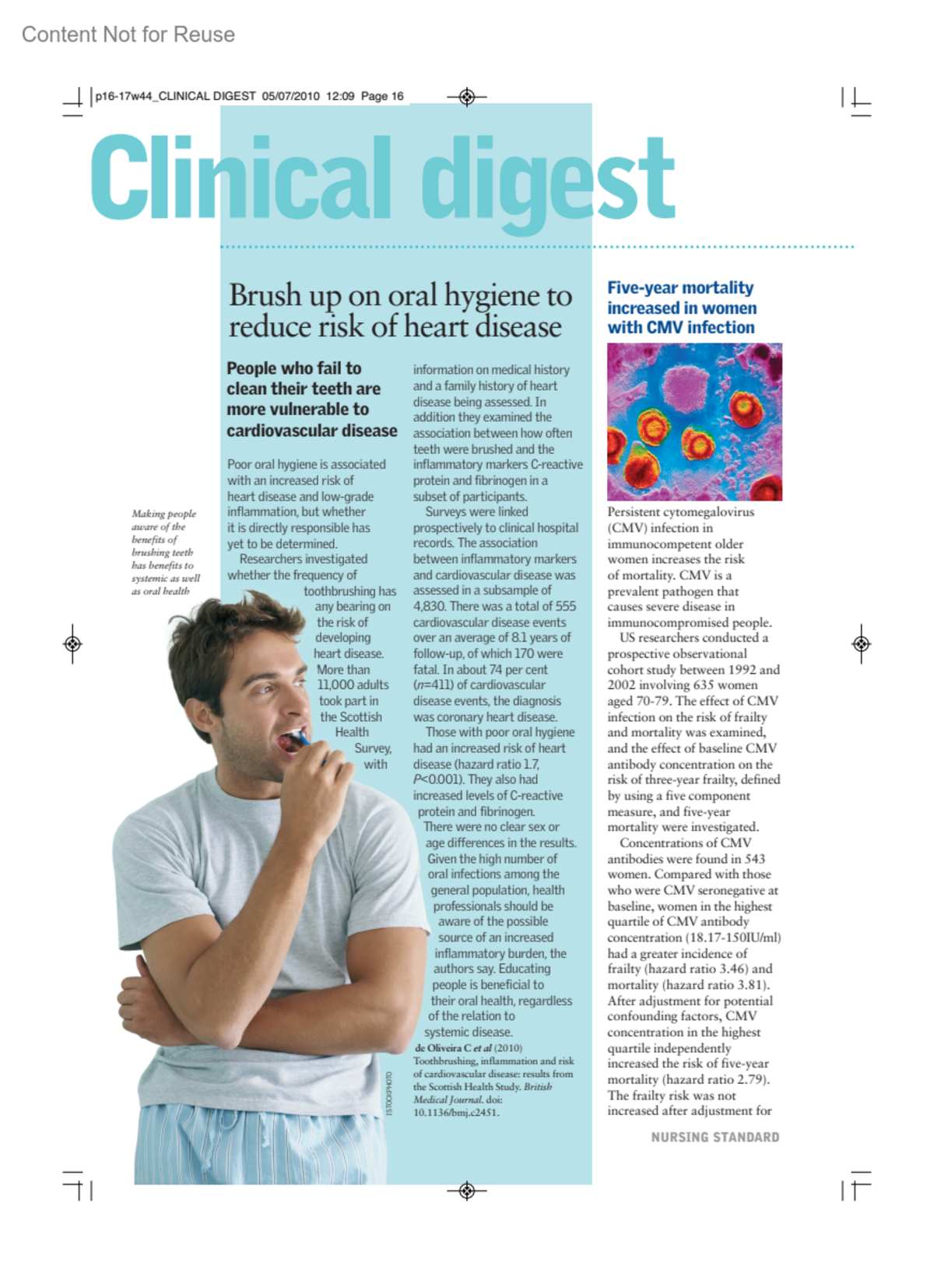 Five-year mortality increased in women with CMV infectionNursing Standard 24(44):p 16-17, July 7, 2010.Copyright © Copyright 2010 RCN Publishing Company Ltd.