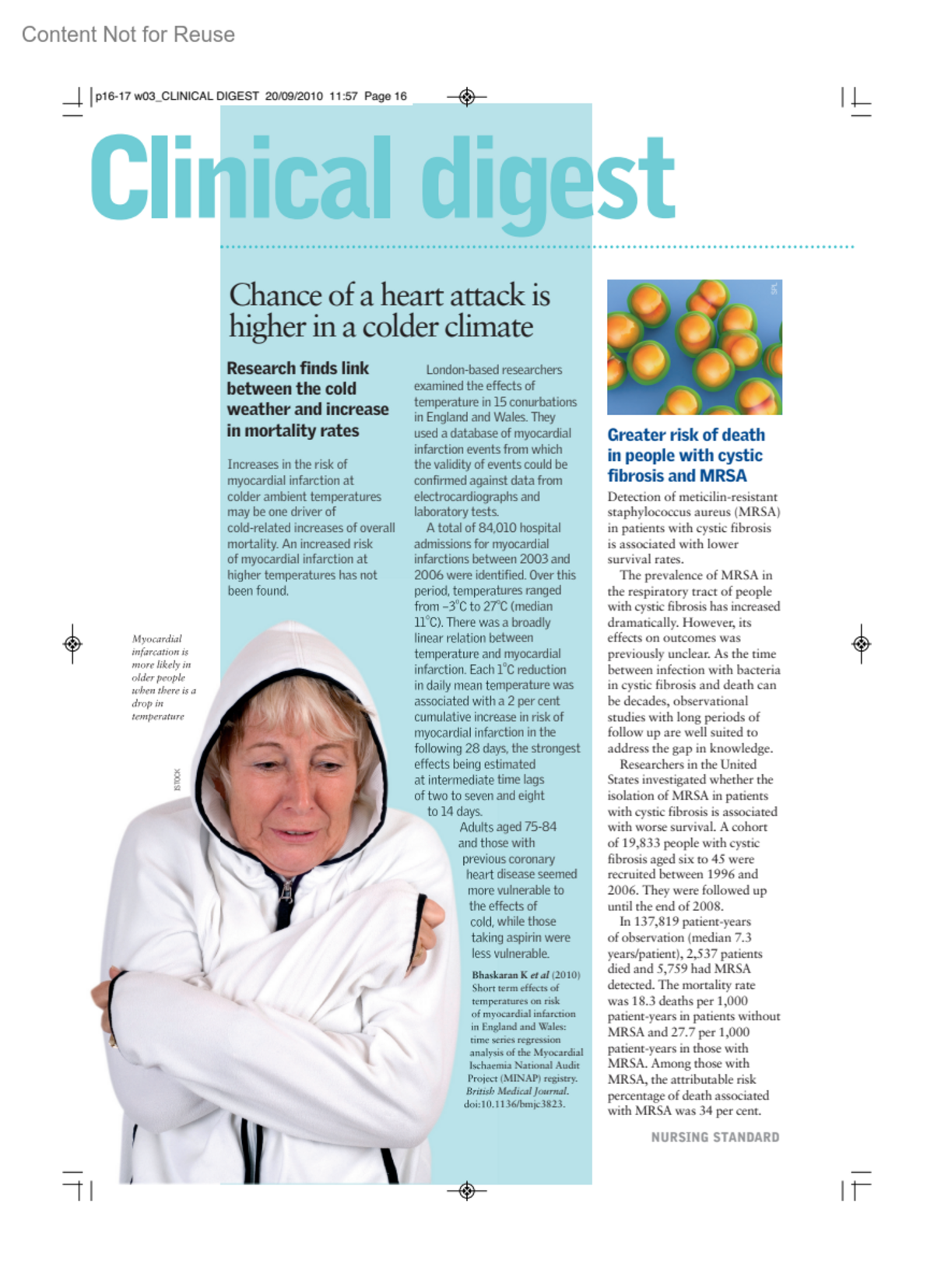 Greater risk of death in people with cystic fibrosis and MRSANursing Standard 25(3):p 16-17, September 22, 2010.Copyright © Copyright 2010 RCN Publishing Company Ltd.